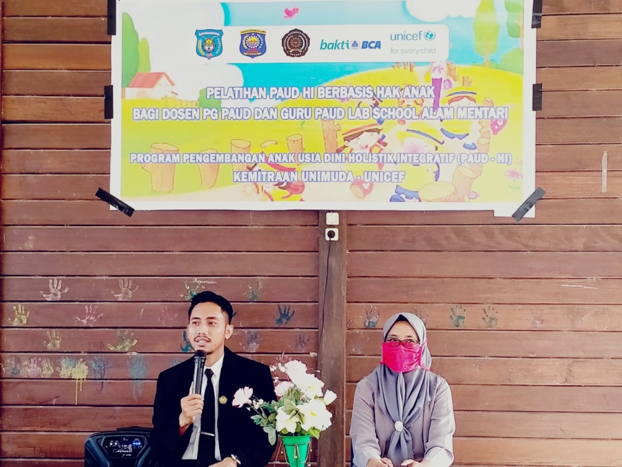 Dekan Fakultas Keguruan dan Ilmu Pendidikan FKIP Unimuda Sorong (Nursalim, M.Pd.) Membuka Secara Resmi Pelatihan Pengembangan Anak Usia Dini Holistik Integratif Berbasis Hak Anak Bagi Dosen PG PAUD dan Guru PAUD Labschool Alam Mentari. Dalam sambutannya beliau menyatakan bahwa ini merupakan bagian dari replikasi program di lingkungan internal Unimuda Sorong. Pelatihan ini menjadi bagian penting bagi pengembangan SDM, khususnya bagi dosen dan guru PAUD Alam Mentari yang nantinya menjadi Laboratorium bagi mahasiswa PG PAUD FKIP Unimuda Sorong. Beliau memilih lokasi di PAUD Alam salah satunya agar para Dosen dapat mengenal lebih dalam tentang kePAUDan, bukan hanya sekedar berteori namun praktiknya juga. Kegiatan ini akan dilanjutkan dengan pelaksanaan peninjauann kurikulum yang ada di Prodi PG PAUD yang mengarah kepada Pengembangan Anak Usia Dini Holistik dan Integratif berbasis Anak.