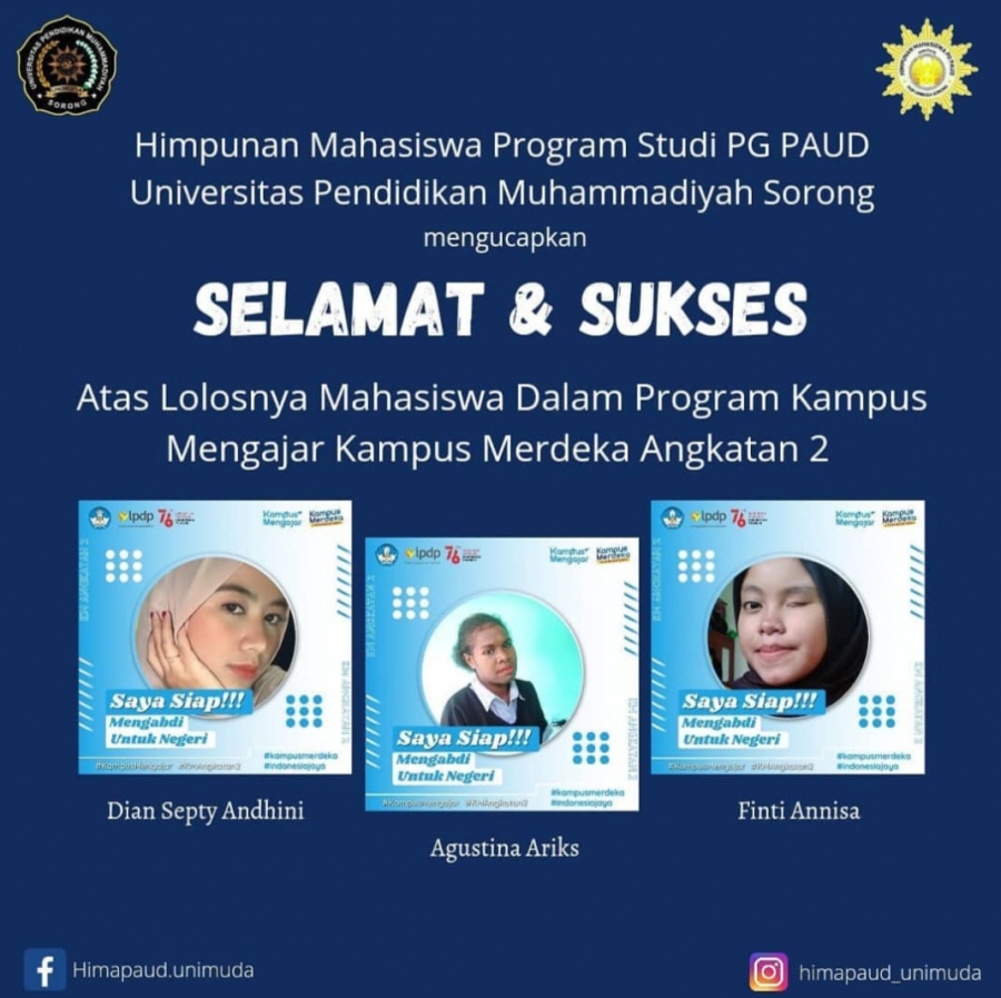 Kaprodi dan Sekprodi beserta seluruh Dosen PGPAUD mengucapkan selamat dan sukses kepada mahasiswa yang berhasil lolos dalam program Kampus Mengajar Angkatan 2 Tahun 2021.