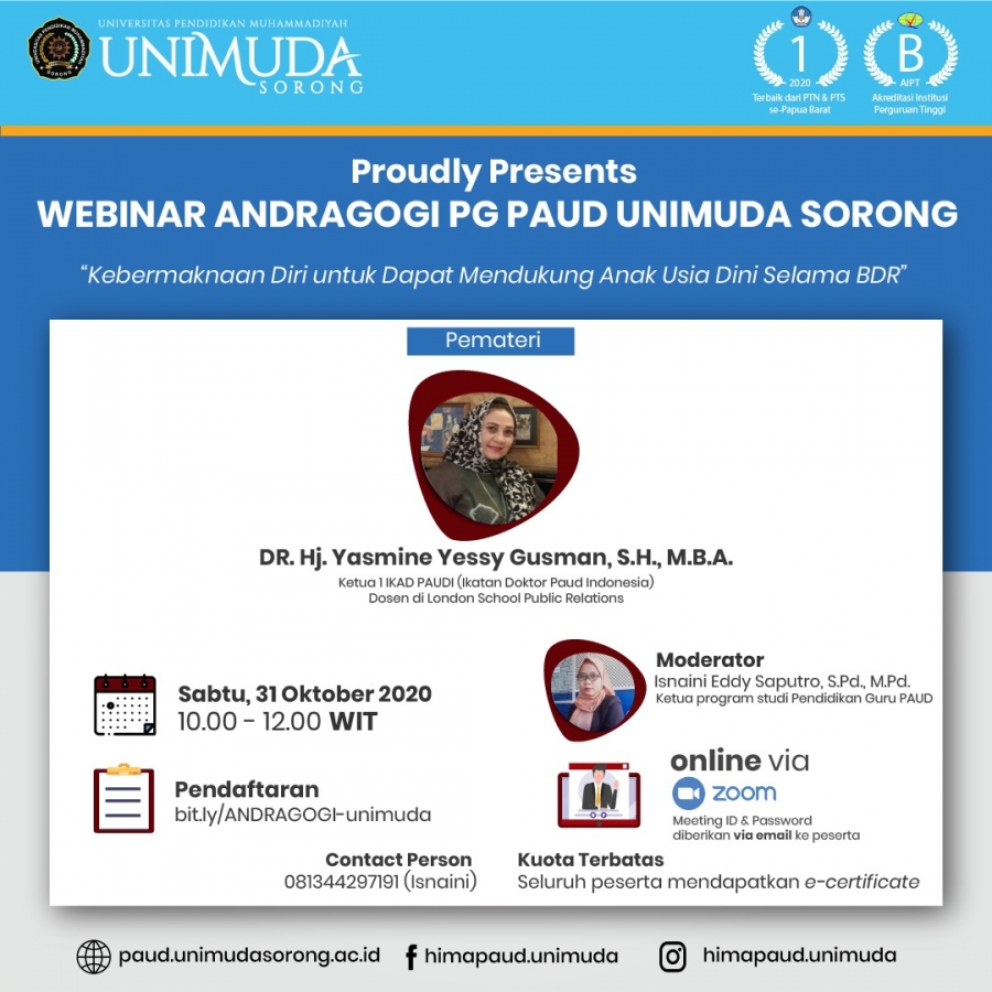 FKIP PG PAUD UNIMUDA Sorong, 31 Oktober 2020 melaksanakan webinar andragogi #1 dengan tema “KEBERMAKNAAN DIRI UNTUK DAPAT MENDUKUNG AUD SELAMA BDR”. Webinar andragogi #1 ini merupakan webinar kedua di program studi PG PAUD yang bernarasumber oleh Dr. Yasmine Yessy Gusman, SH., MBA. yang merupakan Ketua 1 Ikatan Doktor PAUD se-Indonesia. Dalam webinar ini terdapat membahas tentang pengasuhan positif BDR dan mengembangkan pola kecerdasan jamak / multiple intelligence Anak Usia dini. Multiple Intelligence atau yang sering disebut dengan kecerdasan majemuk merupakan teori yang menyatakan bahwa setiap anak memiliki kecerdasan yang berbeda-beda. Kecerdasan yang berbeda-beda tersebut dibedakan menjadi Sembilan kecerdasan menurut Howard Gardner yaitu: musikal, naturalis, linguistik, interpersonal, intrapersonal, visual spasial, logika matematika, kinestetik, dan kecerdasan moral